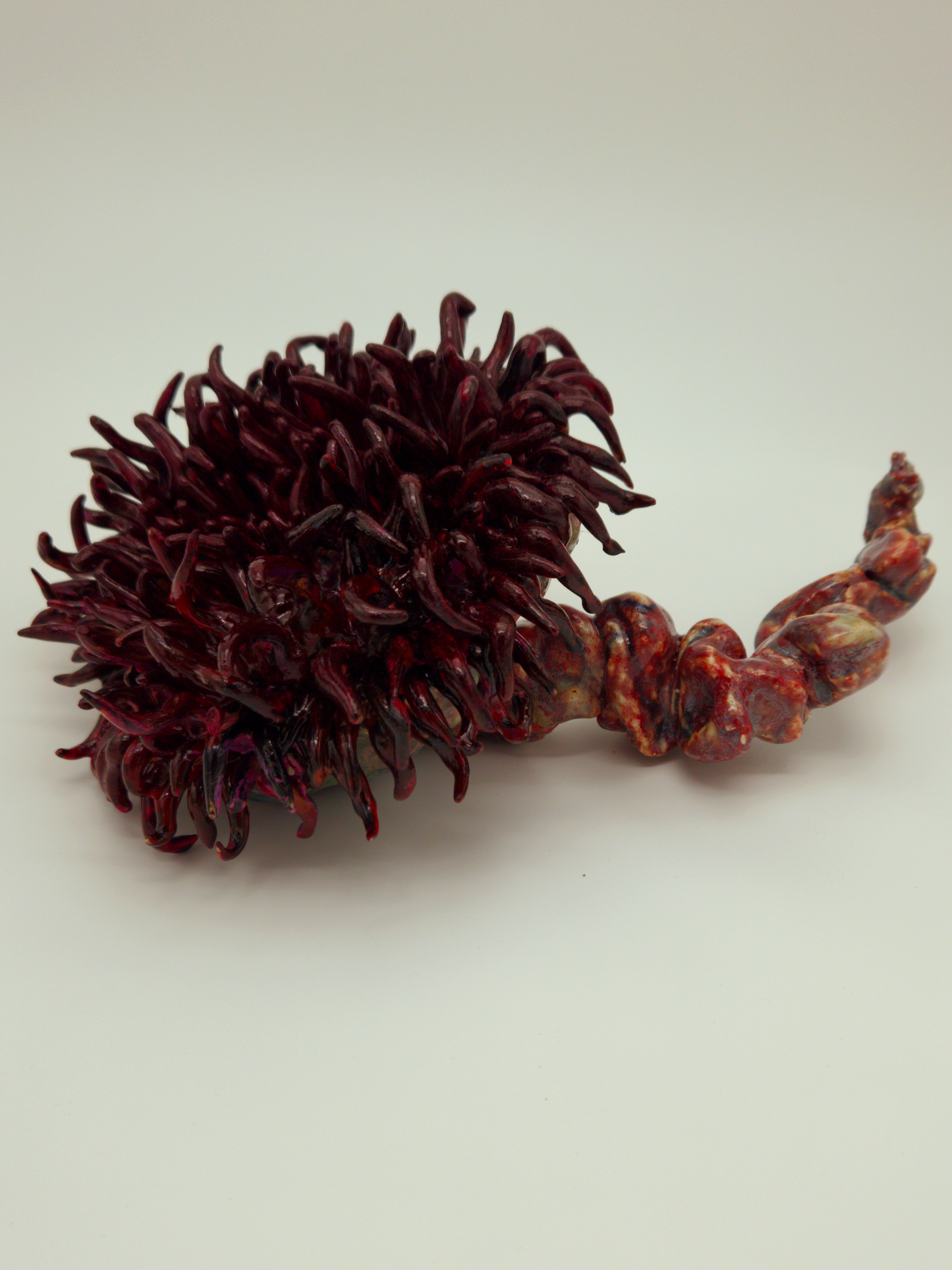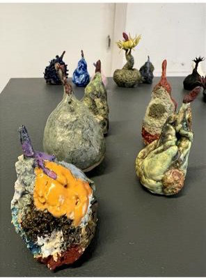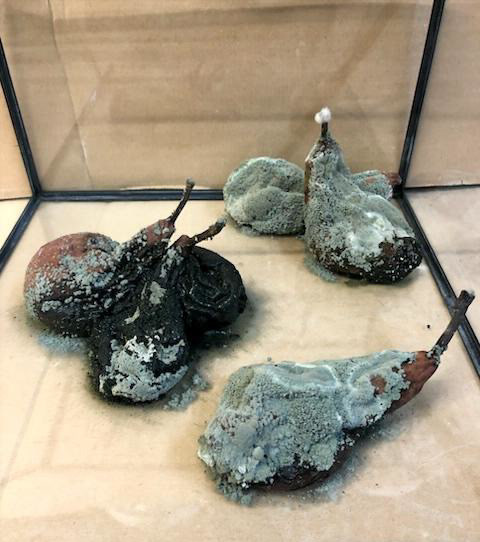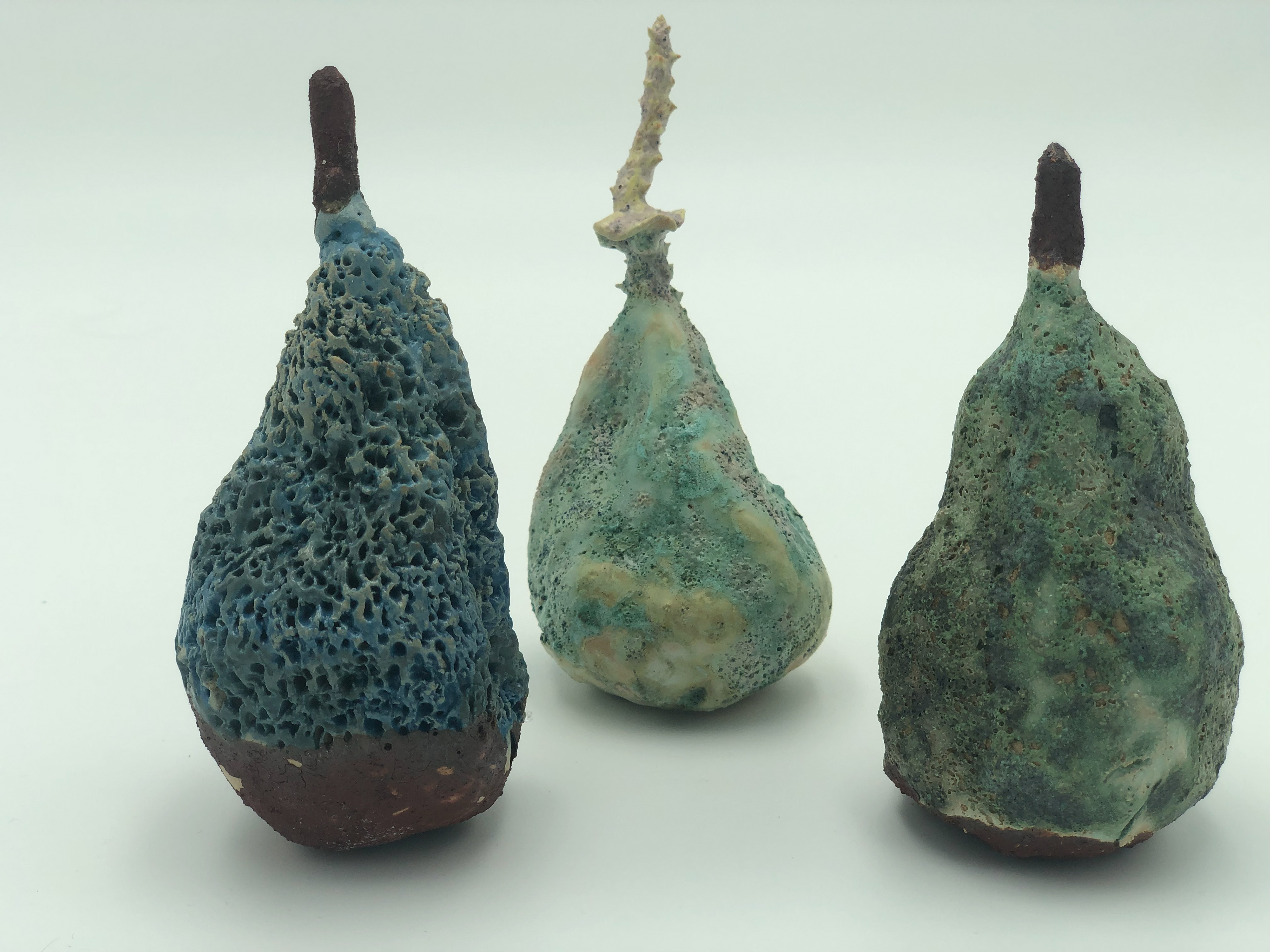 Jeg er optaget af livets cyklus og af det, der sker, når formen opløses. I forfaldet opstår en anden form for skønhed. Udgangspunktet var disse pærer i forrådnelse, på bagrund af dem lavede jeg en undersøgelse af forskellige overflader og glasurer.